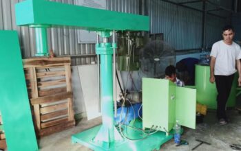 Máy khuấy keo có hệ thống ben thuỷ lực nên có thể nâng hạ được độ cao, máy có trang bị biến tần nên có thể điều chỉnh được tốc độ khuấy.
